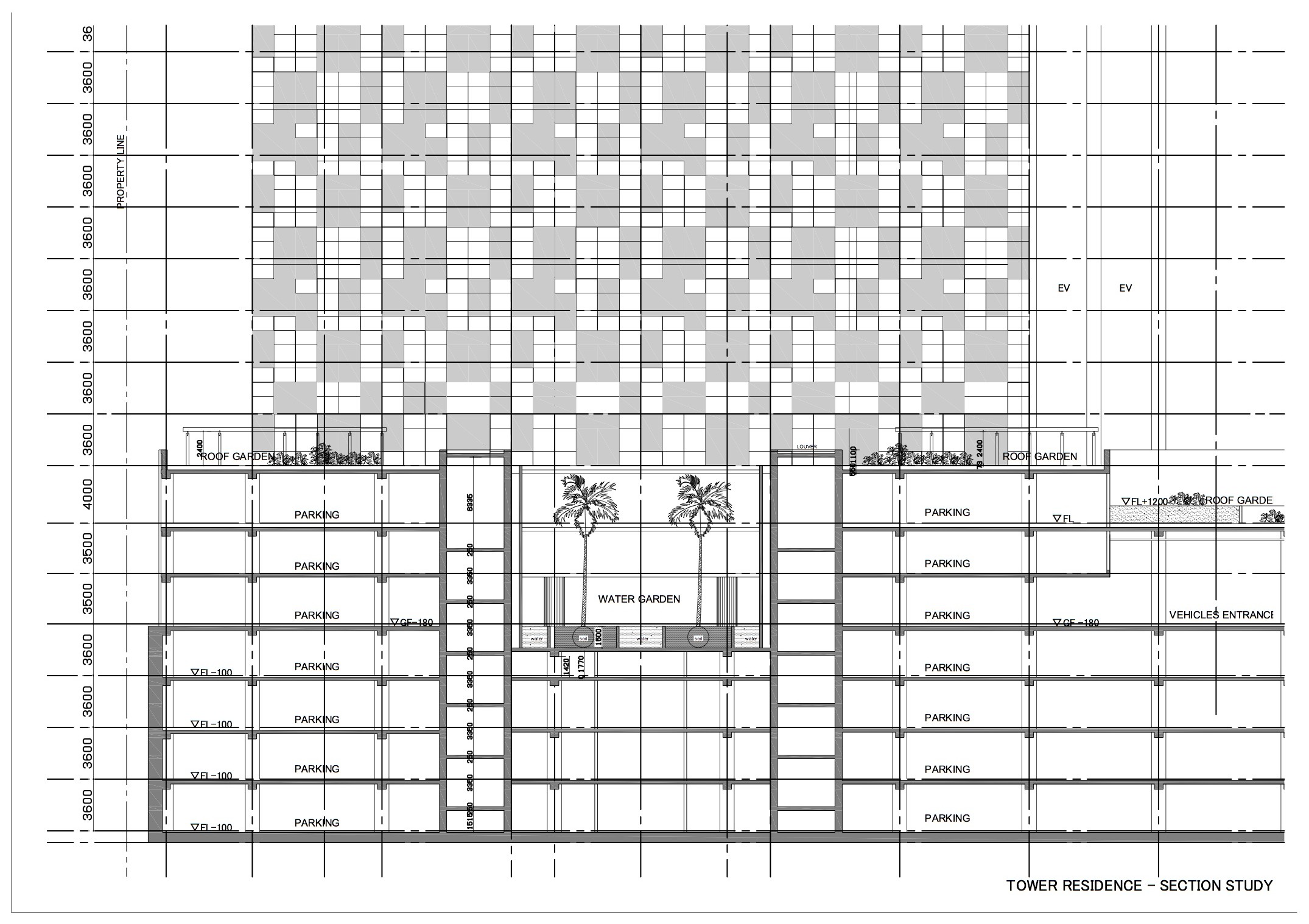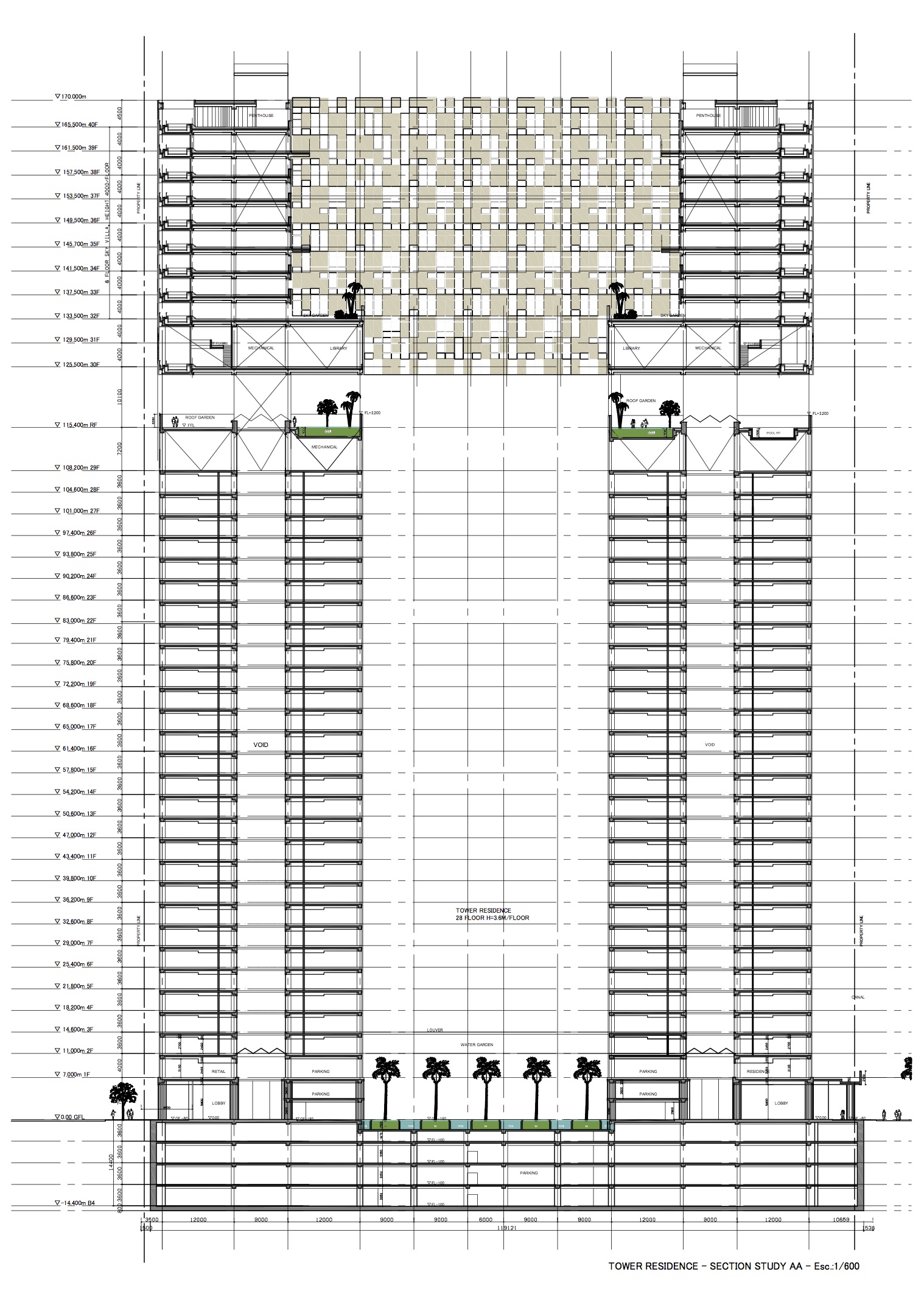 Los cortes o secciones son junto con las plantas las piezas con más información en un anteproyecto. En la etapa de diseño no debemos olvidar que un corte debe haber también el mismo equilibrio compositivo que en plantas y fachadas. Este es un ejmplo de estuido de secciones para un torre residencial en Dubai.